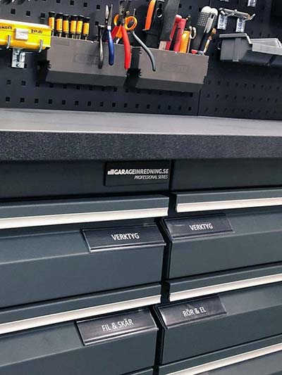 Till vår inredning för garage och verkstad finns många tillbehör. Verktygsvagnar, verktygstavlor, lådinredningar och mycket annat.