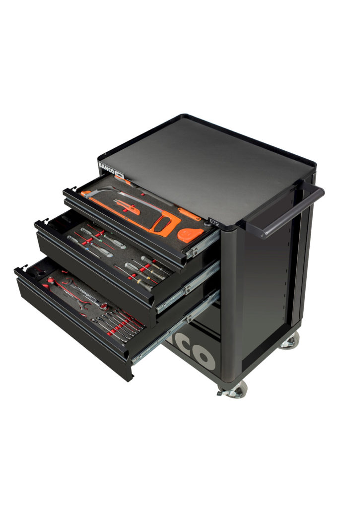 Diskret och stilren vagn i svart med stor uppsättning av verktyg som räcker gott till alla garage för att göra de flesta jobben på bilen, gräsklipparen och alla andra maskiner.