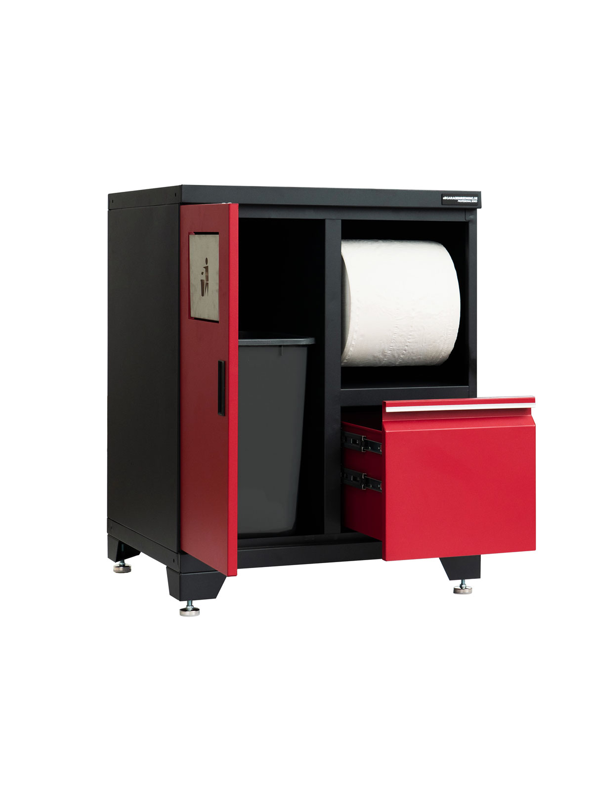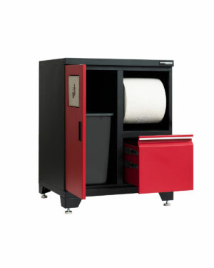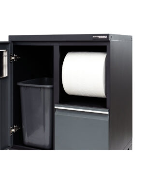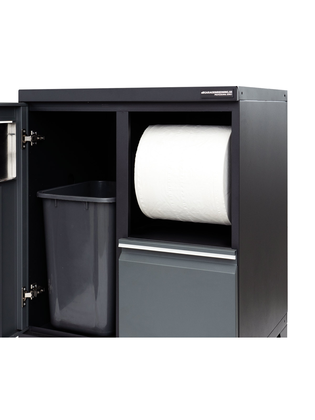 Avfallskåp är ett utmärkt komplement till alla garageinredningar. Ersätt den fula soptunnan som ofta kan stå i vägen och få bort skräp som annars kan samlas och ta upp plats på arbetsbänken. Med denna enhet har du både tork- och avfallshantering snyggt integrerat i garageinredningen.