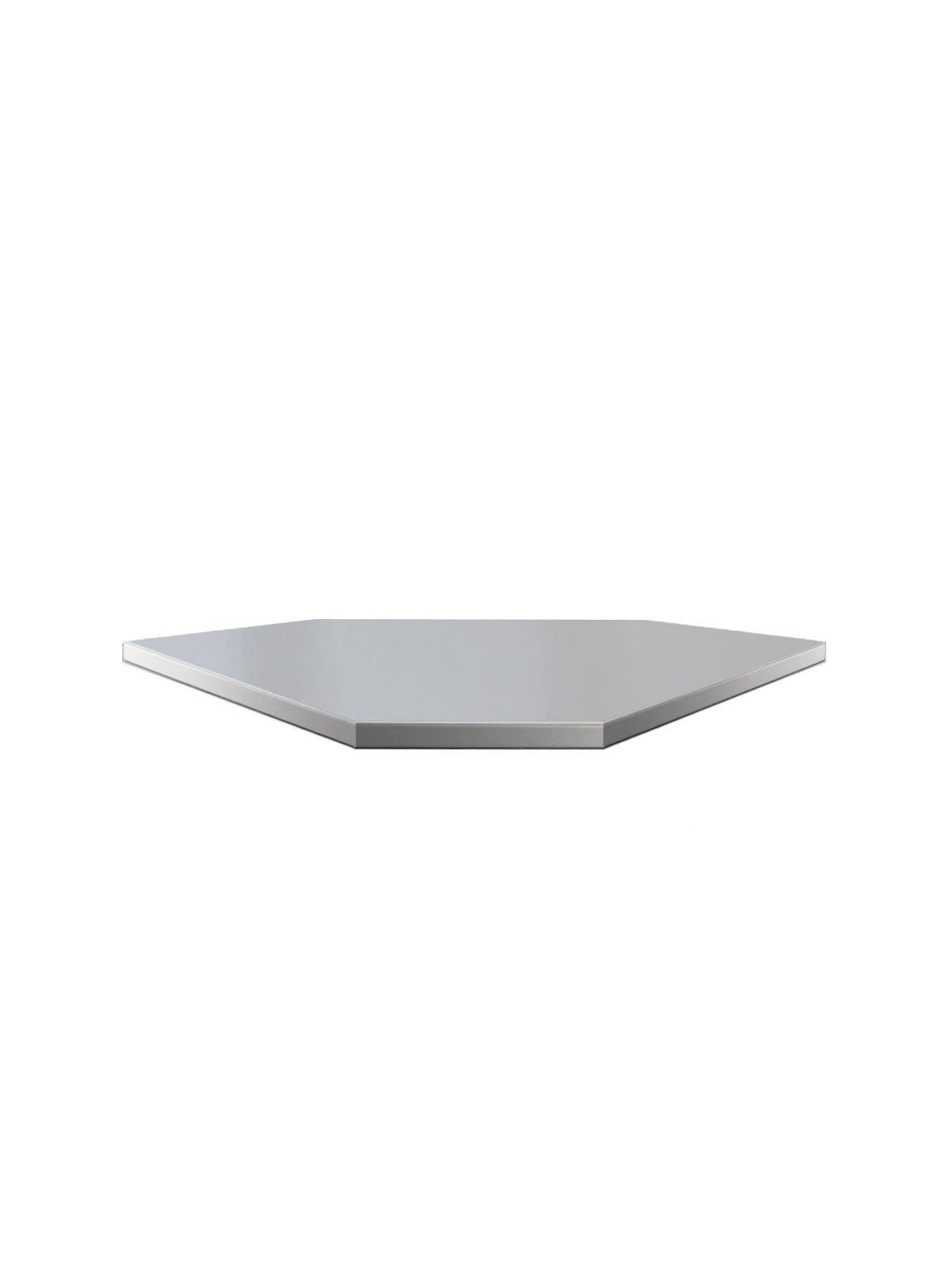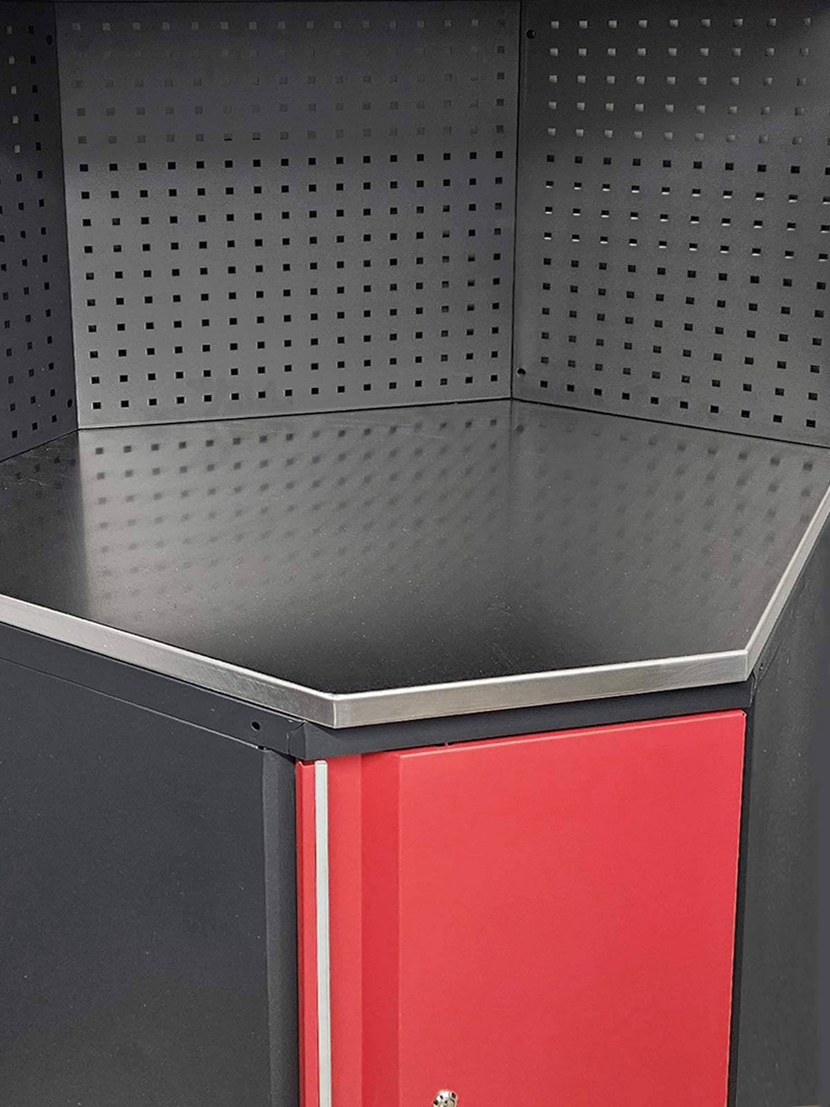 Bänkskiva i 2mm rostfritt stål svetsad över en massiv träkärna. Passar över hörnskåpet i vår garageinredning Professional series.