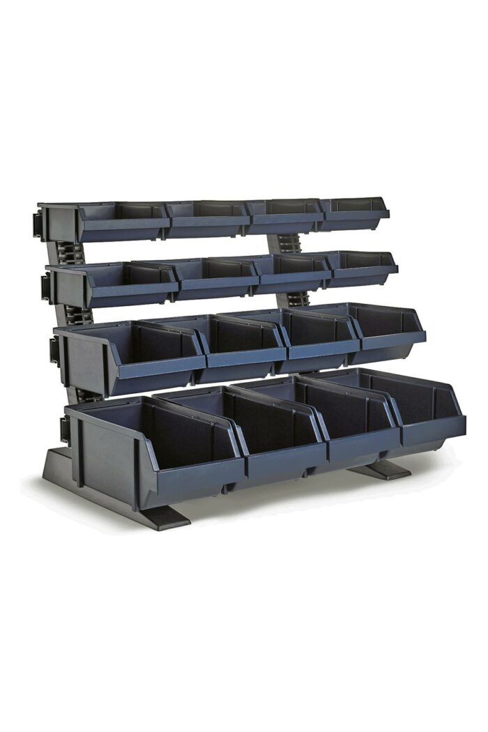 Bordstativ med 16 modulbackar. 8 st. typ 2-80. 4 st. typ 3-160. 4 st. typ 4-280.