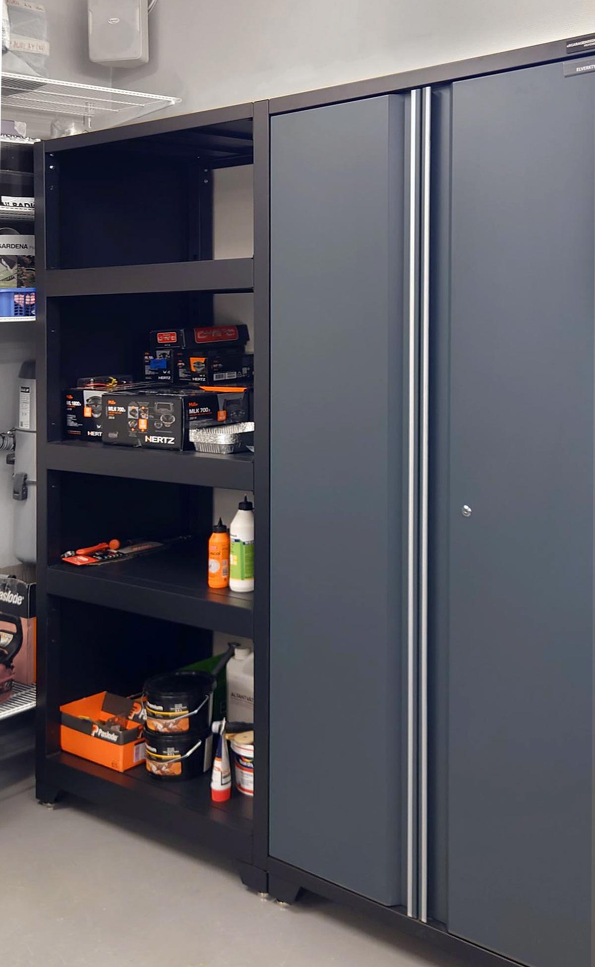 Samma svarta pulverlackade färg som stommarna på våra övriga förvaringskåp.