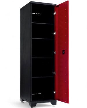 Fyra medföljande hyllplan med en kapacitet på 60kg/hyllplan gör att du inte behöver oroa dig för att lasta för tungt. Dörrarna stängs med mjukstängning och med kraftfulla magneter hålls skåpdörrarna säkert stängda. För extra säkerhet är dessutom alla våra skåpdörrar låsbara. Väderbeständig pulverlackerad stålkonstruktion gör att skåpet är byggt för att hålla i tuffa garage- eller verkstadsmiljöer.