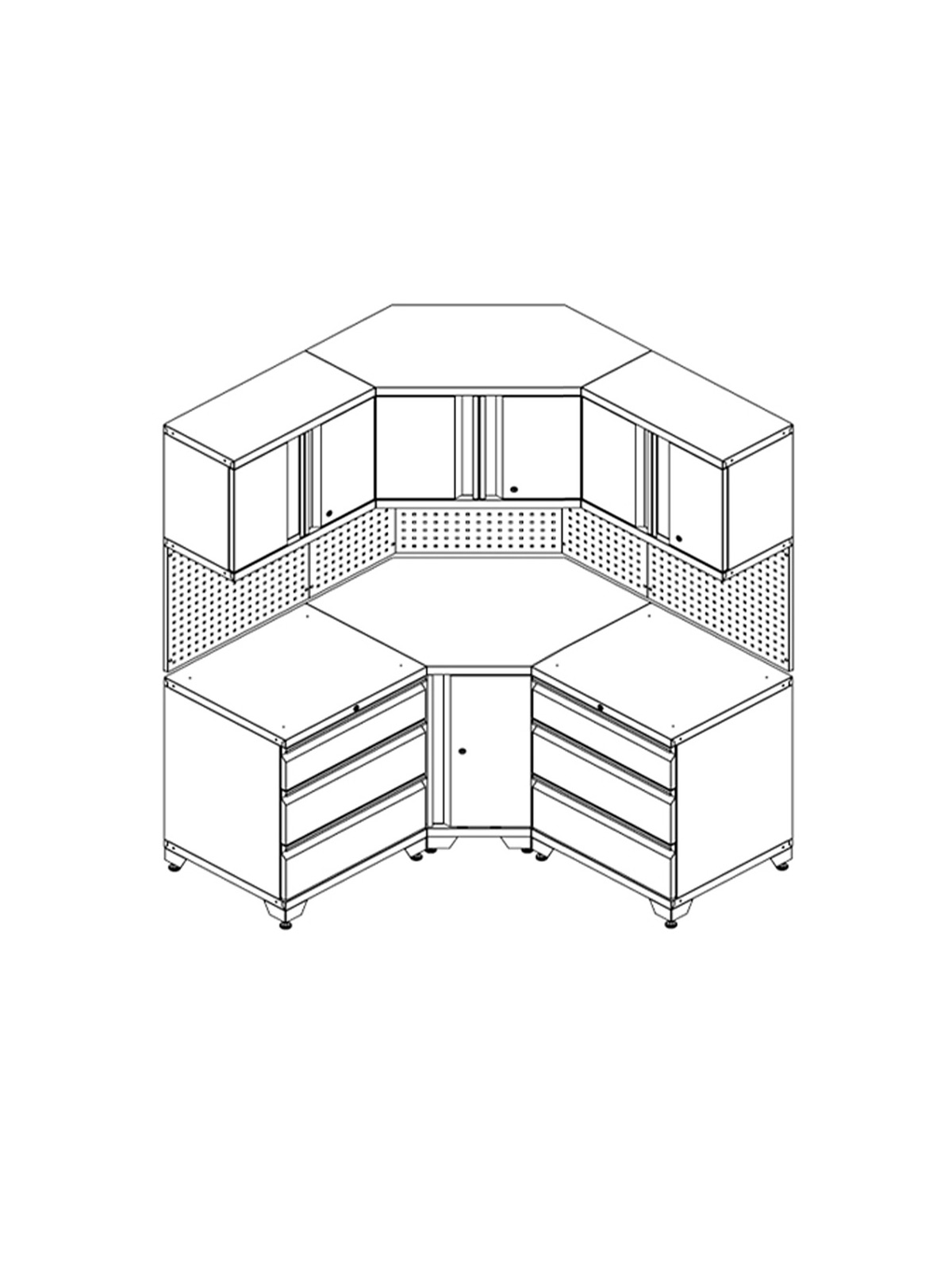 Om skåpet monteras med tillhörande →bänkskiva men utan →verktygstavla kan denna →hörnmodul monteras för att fylla ut det inre hörnet mot vägg.