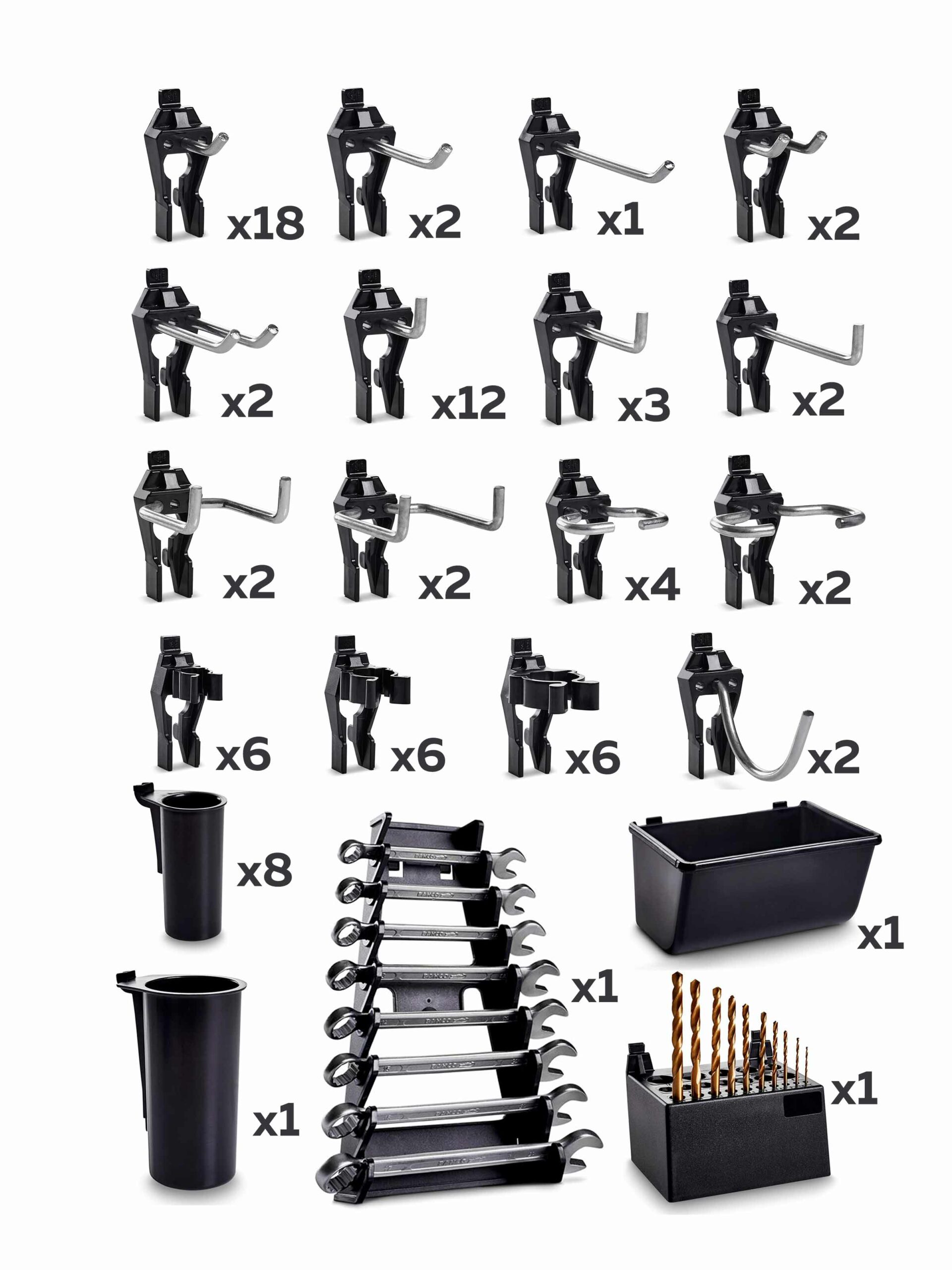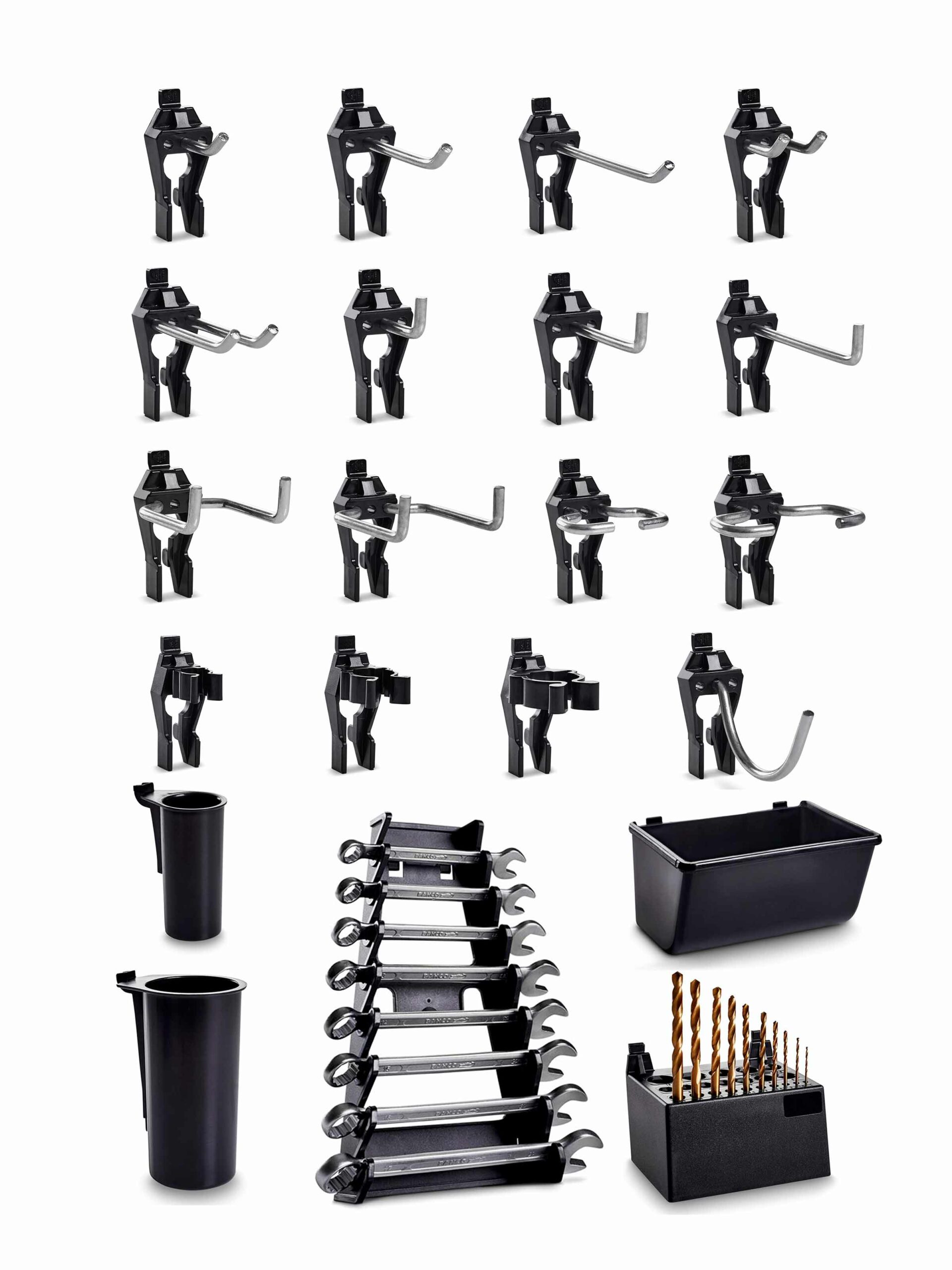 Enkel krok (1–30 mm, 1–60 mm, 1–90 mm): För verktyg som hammare, skruvmejsel och tänger. Dubbla krokar (2–30 mm, 2–60 mm): Perfekt för tyngre föremål eller två verktyg samtidigt. Vinkelkrok (3–25 mm, 3–50 mm): Perfekt för borrmaskiner, elektriska skruvmejslar eller mindre sågar. Hammarhållare (4–40 mm, 4–50 mm): Speciellt för hammare. Tånghållare (5–17 mm, 5–20 mm): Speciellt utformad för tänger. Fjäderklämmor (6–12 mm, 6–18 mm, 6–24 mm): För medelstora verktyg som skruvmejsel eller borstar. Rörhållare (8–30 mm, 8–50 mm): Perfekt för pennor, borstar eller små verktyg. Borrhållare (Clip10): Speciellt för borrar. Skiftnyckelhållare (Clip11): För skiftnycklar. Borrbitshållare (Clip12): Borrbits