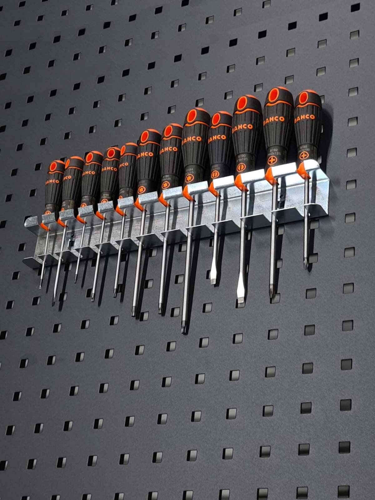 1st mejselhållare som rymmer 12st skruvmejslar och passar våra verktygstavlor eller andra med hålbilden 10mm fyrkantshål i cc38mm.