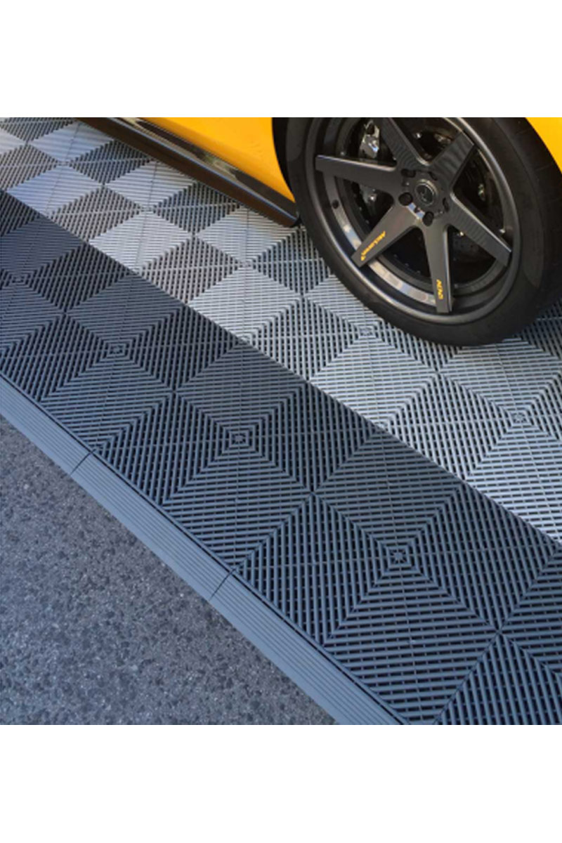 Installation av Swisstrax börjas med fördel i garageportsöppningen och golvet läggs därefter inåt i garaget. Då sitter kantbitarna fast under respektive golvplatta.