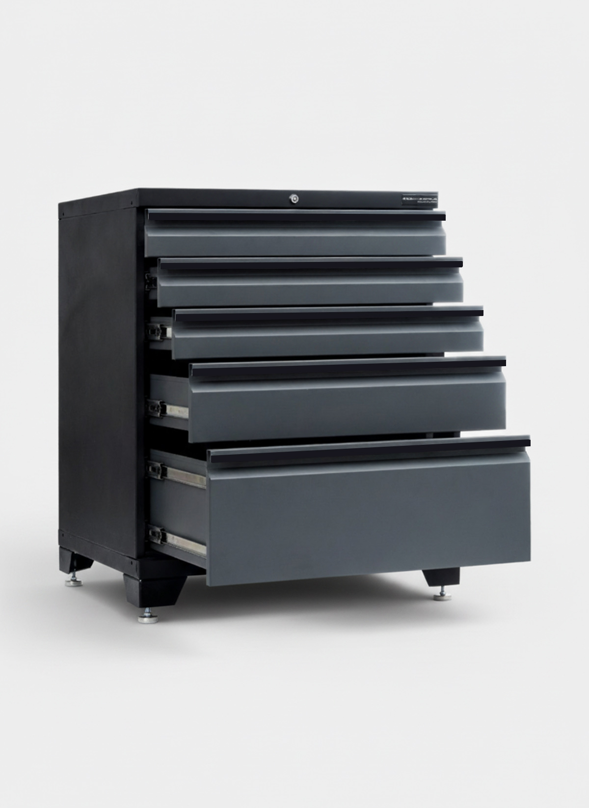 Detta skåp med 5 lådor levereras färdigmonterat och låsbara med ett centrallåssystem för extra säkerhet. Alla lådor har aluminiumlister på handtag, kullagerskenor med fullt utdragsdjup och svarta EVA antiglidmatta.