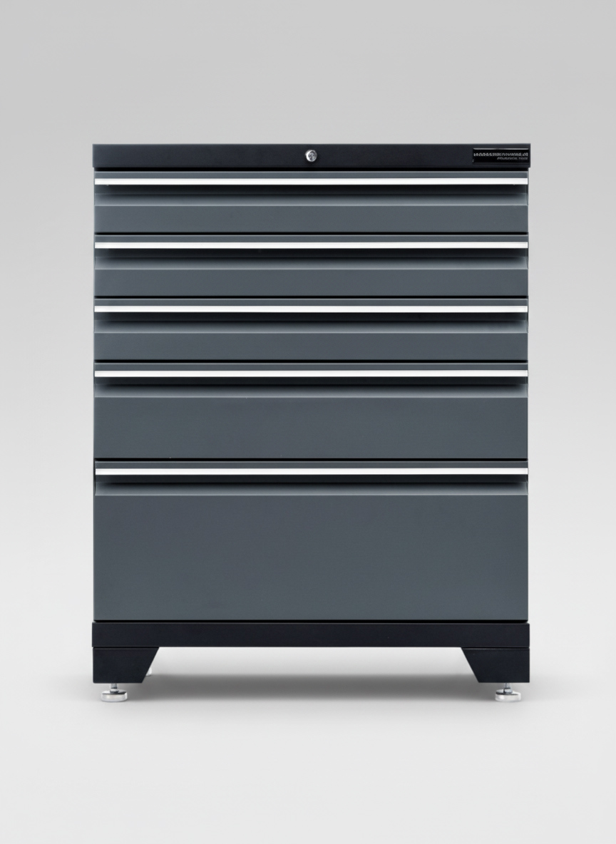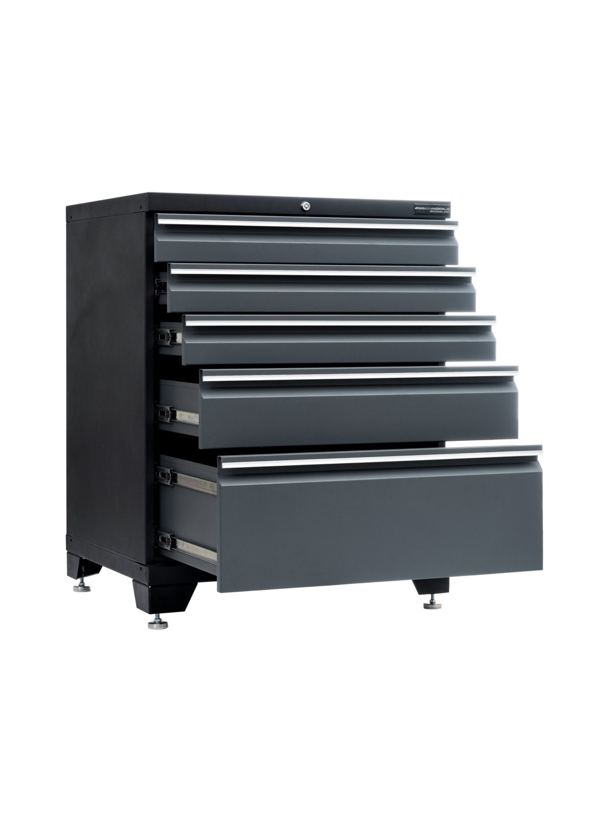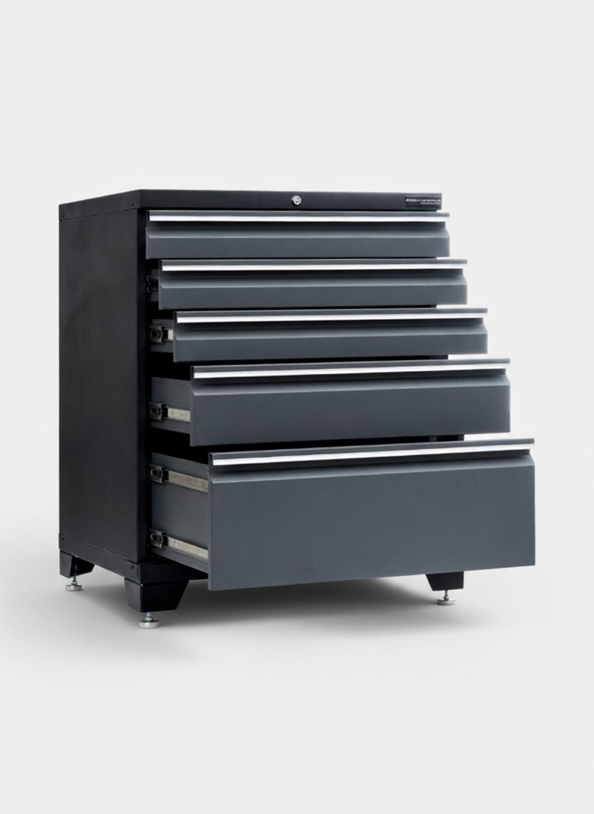 Detta skåp med 5 lådor levereras färdigmonterat och låsbara med ett centrallåssystem för extra säkerhet. Alla lådor har aluminiumlister på handtag, kullagerskenor med fullt utdragsdjup och svarta EVA antiglidmatta.