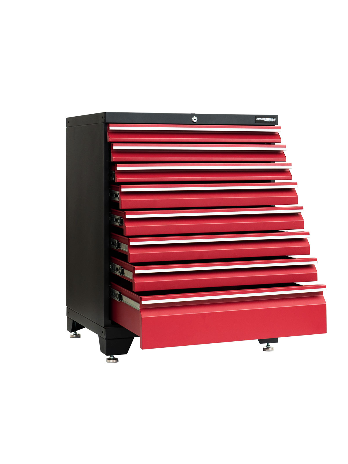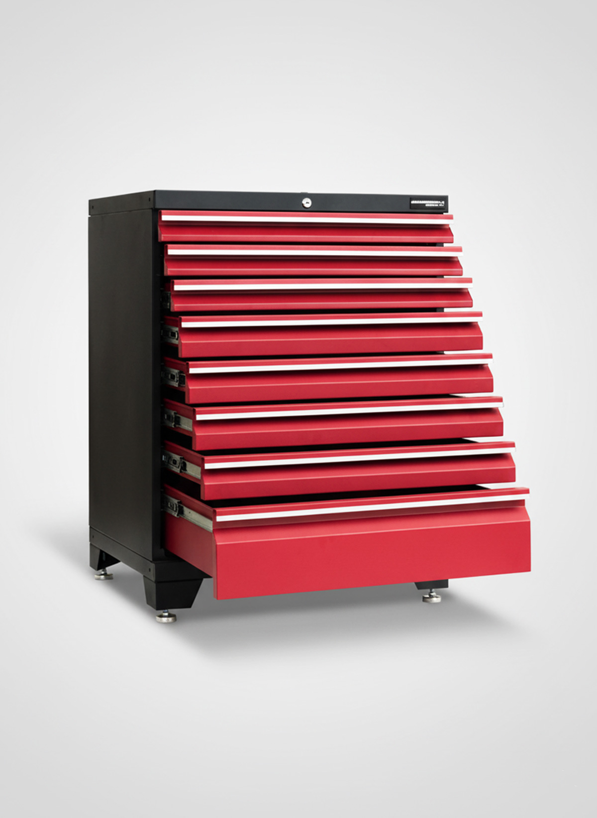 Detta skåp med 8 lådor levereras färdigmonterat och låsbara med ett centrallåssystem för extra säkerhet. Alla lådor har aluminiumlister på handtag, kullagerskenor med fullt utdragsdjup och svarta EVA antiglidmatta.