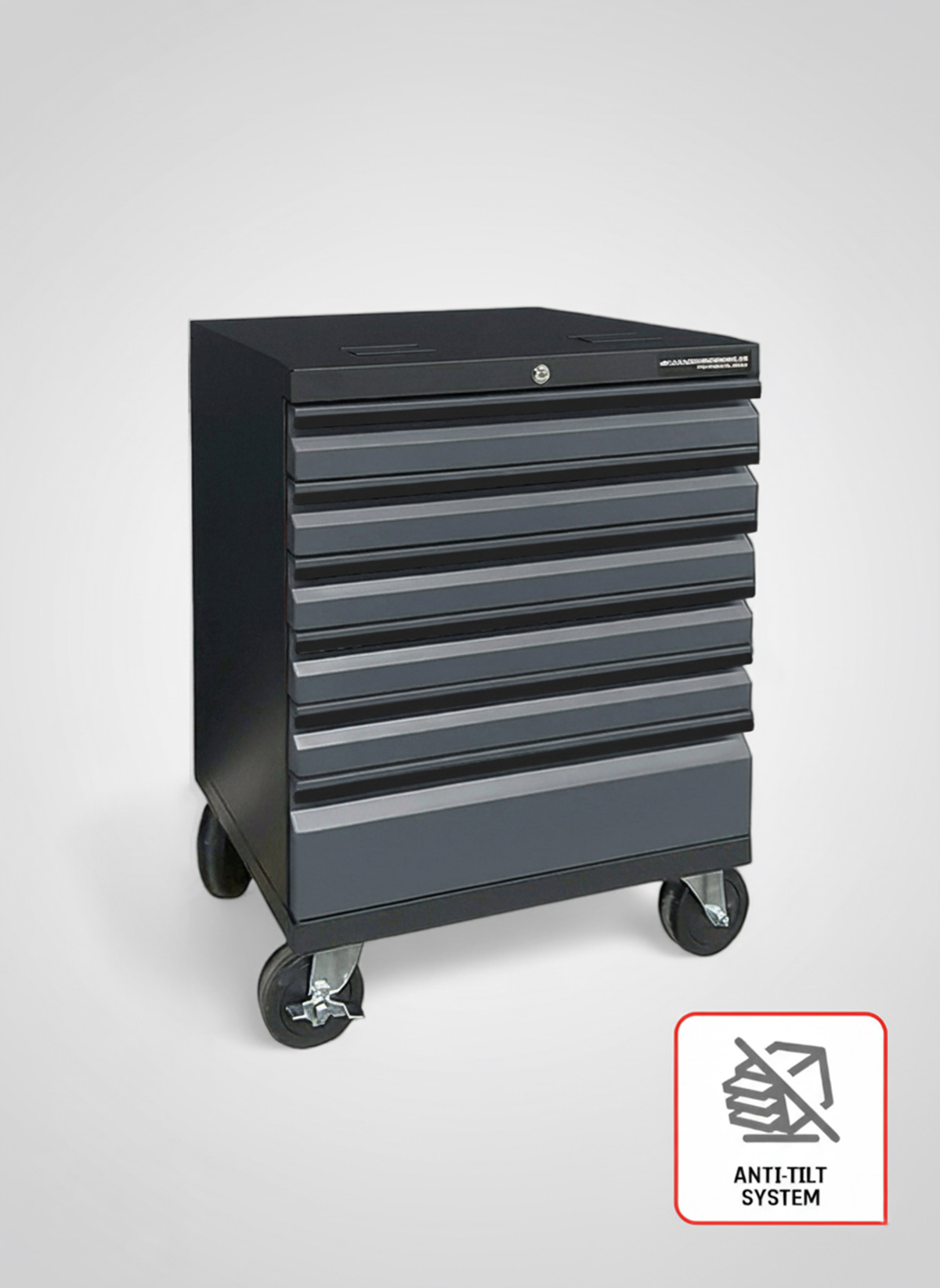 Högkvalitativ verktygsvagn i som är anpassad måttmässigt att ersätta ett golvskåp. Försedd med hjul som gör det enkelt dra ut vagnen till din arbetsplats och därefter styra in den under arbetsbänken igen. De sex lådorna ger gott om förvaringsutrymme för dina verktyg.