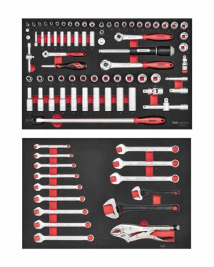 73-delars hylsnyckelsats. 1/4″, 3/8″ och 1/2″ fyrkantsfäste. Tre 72-tandade spärrhandtag (1/4″, 3/8″, 1/2″). Inkluderar 1/2″ ledhandtag (450 mm) och skruvmejselhandtag för hylsor(1/4″, 3/8″). Förlängare: 1/2″ (63,5 mm, 150 mm), 1/4″ (50 mm, 100 mm), 3/8″ ledad (75 mm). Universalknutar och adaptrar (1/2″F-3/8″M, 3/8″F-1/4″M, 3/8″F-1/2″M). Metriska hylsor i standard och lång modell i storlekar från 4 mm till 24 mm. 6-kant och 12-kant hylsor. 3/8″ bitshållare för 1/4″ bits.