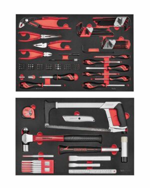 15-delars generell verktygssats. 24 TPI bågfil för metallkapning. Brytbladskniv för allmänt bruk. Två flatmejslar (18 mm och 25 mm). 5 mm körnare. Drivdorn (3 mm till 8 mm). 24 oz kulhammare. Plasthammare. 3-meters mätband med metrisk skala och tumskala. 200 mm stålskala med metrisk och tumgradering.