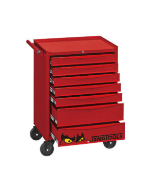 Verktygsvagn i tjockväggigt stål med röd pulverbeläggning. Sju lådor som kan dras ut hela vägen med 30 KG belastningskapacitet. Förmonterade, tåliga länkhjul (5″ × 2″) (två fasta, två svängbara med broms) och sidohandtag av metall. Inbyggt nyckellås. Kompatibel med TengTools verktygslösning.