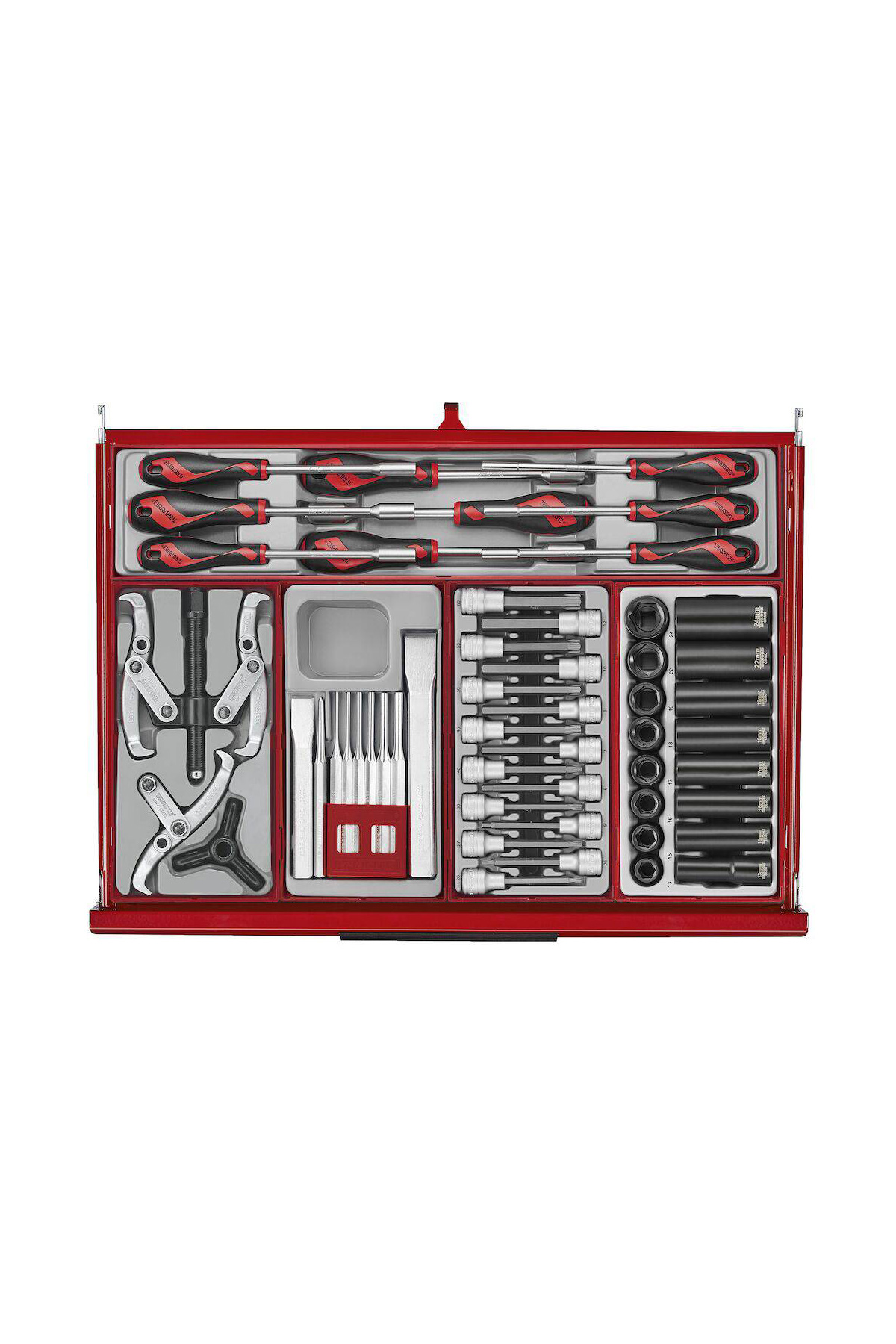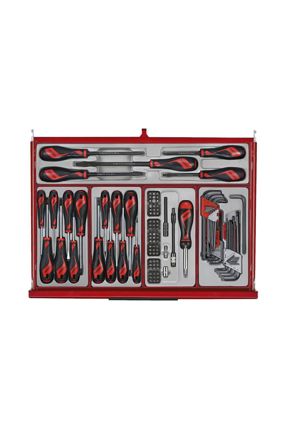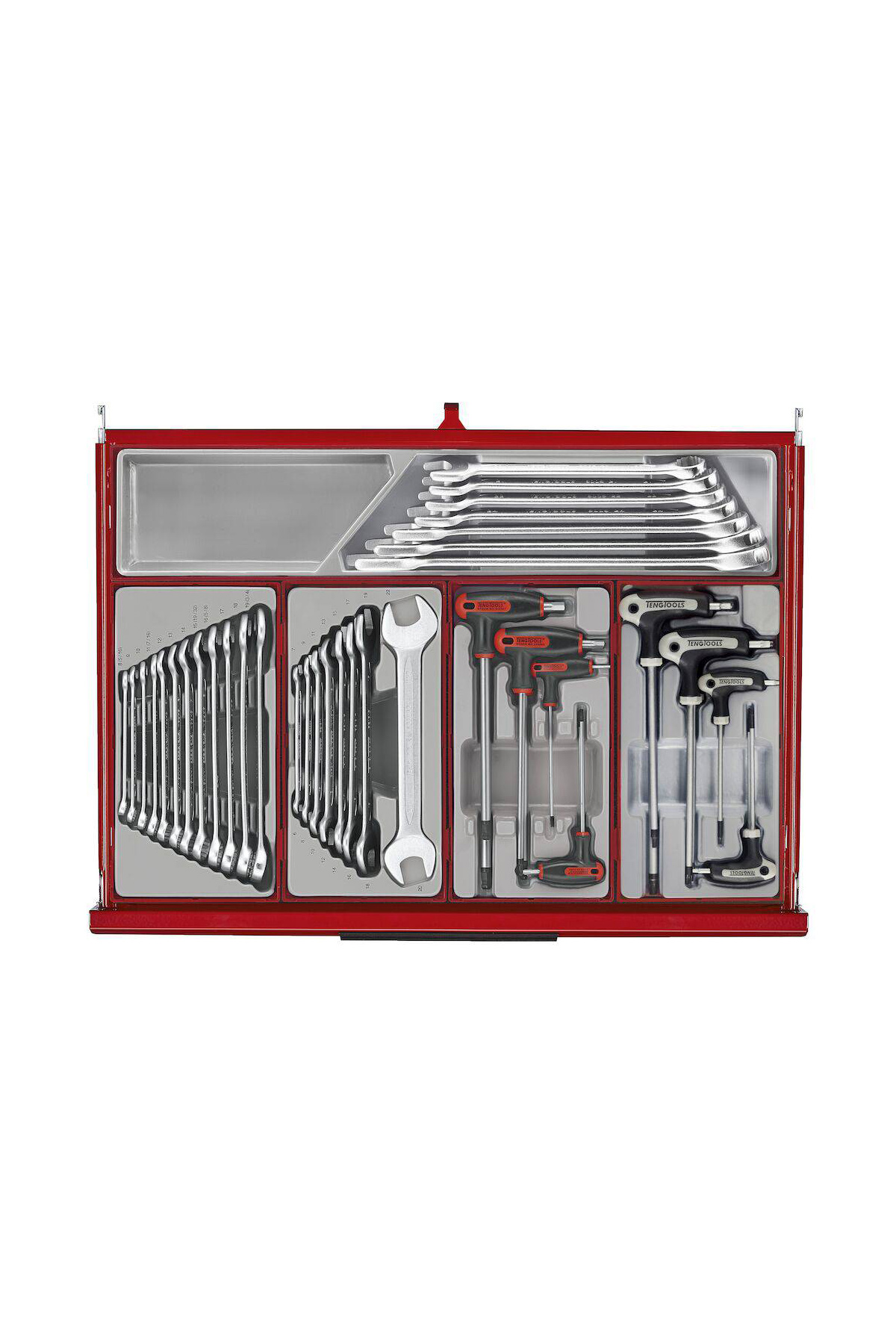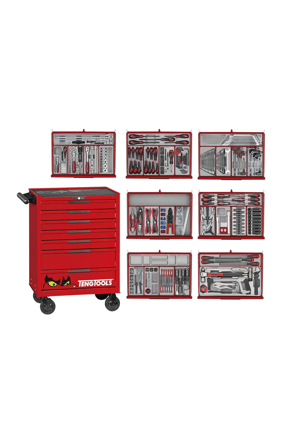 TengTools 26″ PRO35 verktygssats TKW26R628T i matt röd är en mångsidig och robust verktygssats med 628 delar, utformad för yrkesverksamma inom olika industriella tillämpningar. Den inkluderar ett brett urval av verktyg avsedda för industriellt bruk, inklusive 12-punkts hylsor med 1/4″, 3/8″ och 1/2″ fyrkantiga driv, bits-hylsor, spärrhandtag, slagverktyg, kombinationsnycklar, skruvmejslar, bits, sexkantiga och TX-nycklar med T-handtag, tänger, filer, dragverktyg, skrapverktyg och andra handverktyg. Alla verktyg är placerade i moduler som är en del av TengTools Tool Control System, vilket främjar en organiserad arbetsyta och underlättar snabb identifiering av saknade verktyg. TSW26R7-rullskåpet mäter 680 mm i bredd, 460 mm i djup och 960 mm i höjd med hjul monterade. Den har sju helt utdragbara lådor: fem lådor med en höjd på 75 mm och två större lådor på 154 mm. Varje låda är utrustad med smidiga kullagerförsedda glidskenor och en ljuddämpande EVA-matta som skyddar både verktygen och minskar ljudnivåerna. Varje låda har en lastkapacitet på upp till 40 kg. En 5 mm EVA-matta ingår för översidan av rullskåpet. För att underlätta rörelsen är skåpet utrustat med två 5″ bromsade svänghjul och två 5″ fasta hjul, tillsammans med ett komforthandtag. Ovanför lådorna på fronten av skåpet finns ett 3-siffrigt kombinationslås som låser alla lådor. Skåpet har också tillbehörshål på båda sidor. Setet inkluderar en pappersrullehållare (TCA08). Funktioner: