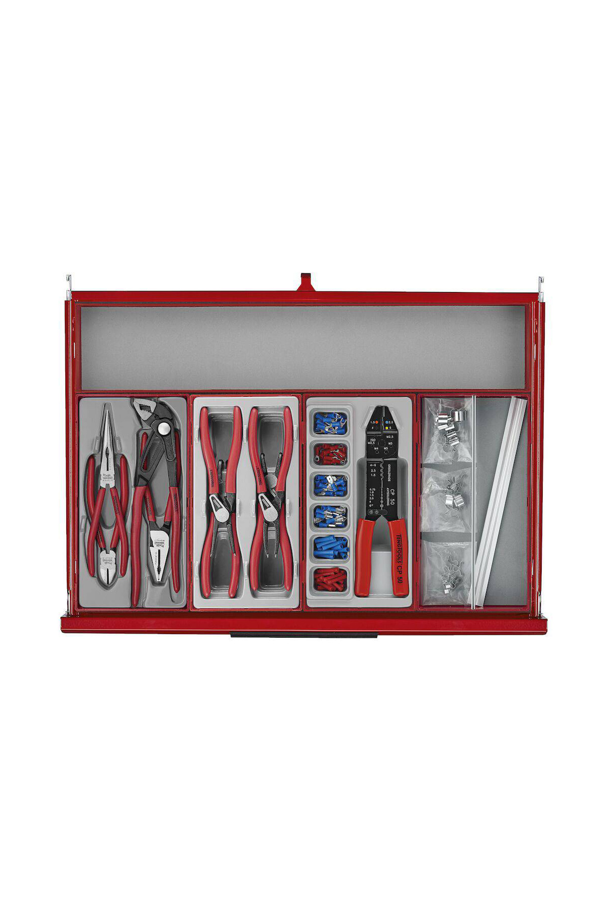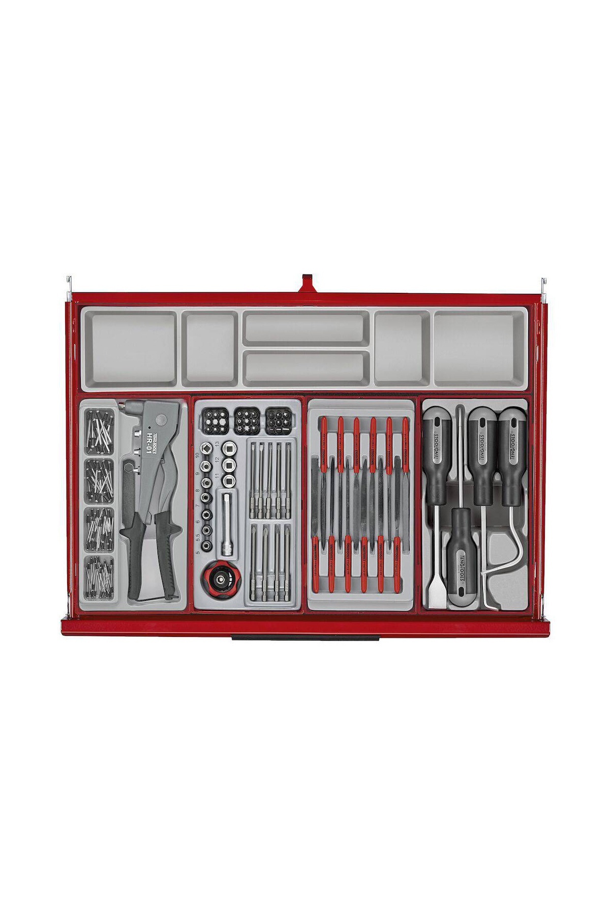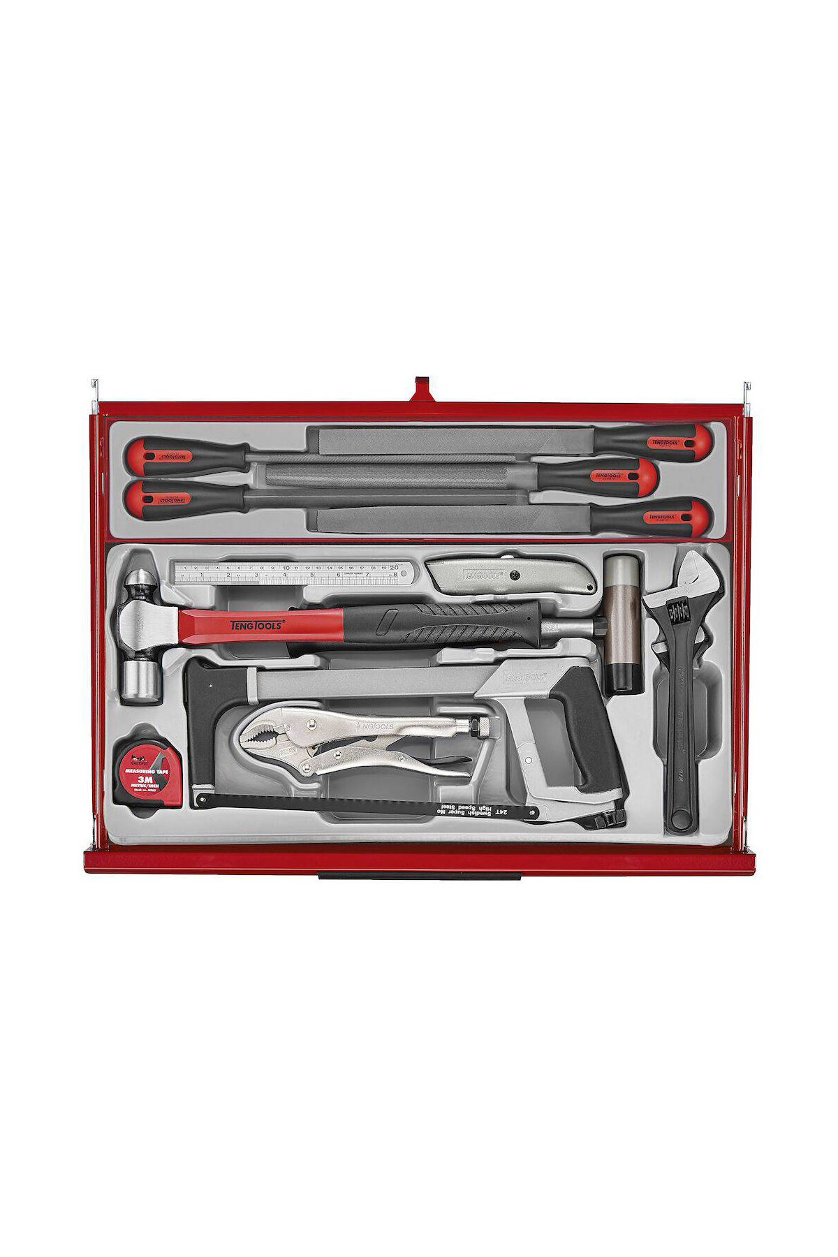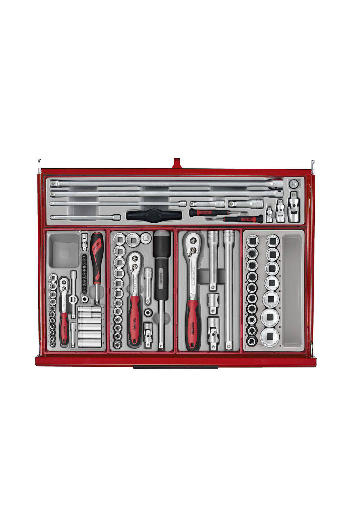 TengTools 26″ PRO35 verktygssats TKW26R628T i matt röd är en mångsidig och robust verktygssats med 628 delar, utformad för yrkesverksamma inom olika industriella tillämpningar. Den inkluderar ett brett urval av verktyg avsedda för industriellt bruk, inklusive 12-punkts hylsor med 1/4″, 3/8″ och 1/2″ fyrkantiga driv, bits-hylsor, spärrhandtag, slagverktyg, kombinationsnycklar, skruvmejslar, bits, sexkantiga och TX-nycklar med T-handtag, tänger, filer, dragverktyg, skrapverktyg och andra handverktyg. Alla verktyg är placerade i moduler som är en del av TengTools Tool Control System, vilket främjar en organiserad arbetsyta och underlättar snabb identifiering av saknade verktyg. TSW26R7-rullskåpet mäter 680 mm i bredd, 460 mm i djup och 960 mm i höjd med hjul monterade. Den har sju helt utdragbara lådor: fem lådor med en höjd på 75 mm och två större lådor på 154 mm. Varje låda är utrustad med smidiga kullagerförsedda glidskenor och en ljuddämpande EVA-matta som skyddar både verktygen och minskar ljudnivåerna. Varje låda har en lastkapacitet på upp till 40 kg. En 5 mm EVA-matta ingår för översidan av rullskåpet. För att underlätta rörelsen är skåpet utrustat med två 5″ bromsade svänghjul och två 5″ fasta hjul, tillsammans med ett komforthandtag. Ovanför lådorna på fronten av skåpet finns ett 3-siffrigt kombinationslås som låser alla lådor. Skåpet har också tillbehörshål på båda sidor. Setet inkluderar en pappersrullehållare (TCA08). Funktioner: