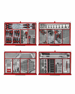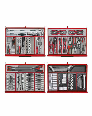 TengTools 53″ PRO35™ verktygssats TKW53R615T i matt röd kulör är utformad för professionella användare inom industrisektorn. Verktygssatsen omfattar 615 hållbara delar vars variation gör den till en tillgång i en mängd olika industriella miljöer. Kärnan i verktygssatsen utgörs av verktygsvagnen TSW53R9 som är 1350 mm bred, 460 mm djup och 813 mm hög (983 mm med monterade hjul). De nio fullt utdragbara lådorna ger gott om förvaringsutrymme. Sex av lådorna är 75 mm höga, två lådor är 154 mm höga och den större översta lådan har en höjd på 160 mm för större föremål. Varje låda har en lastkapacitet på upp till 40 kg. Verktygssatsen innehåller en mängd olika verktyg som är oumbärliga för industriellt arbete, inklusive hylsor med 1/4″, 3/8″, 1/2″ och 3/4″ fyrkantsfäste, bitshylsor, spärrhandtag, kraftverktyg, kombinationsnycklar, skruvmejslar, bits, insexnycklar och tx-nycklar med T-handtag, tänger, nycklar och hylsor i tumstorlekar, avdragare samt andra vanliga verktyg. Dessa verktyg är systematiskt organiserade i dedikerade moduler som utgör TengTools Tool Control System vilket främjar ordning och reda på arbetsplatsen samt underlättar snabb identifiering av saknade eller felplacerade verktyg. Verktygsvagnen har en robust 3-delad konstruktion i kraftigt stål som garanterar dess hållbarhet vid krävande industriella förhållanden. Den har dessutom behandlats med en fosfatfri 5-stegs rostskyddsbehandling. Varje låda är utrustad med kullagrade skenor och försedd med en bullerreducerande EVA-matta som skyddar både verktygen och lådan. För enkel förflyttning och stabilitet har verktygsvagnen försetts med fyra kraftiga 6″ svängbara hjul varav två är bromsade. Ett 3-siffrigt kombinationslås gör det svårare för obehöriga att komma åt verktygen inuti. Verktygsvagnen har hål på båda sidor för montering av tillbehör vilket ger utökade anpassningsmöjligheter. En pappershållare (TCA08) ingår i verktygssatsen, samt en 18 mm tjock bänkskiva av laminat MDF som utgör en tålig och praktisk arbetsyta.