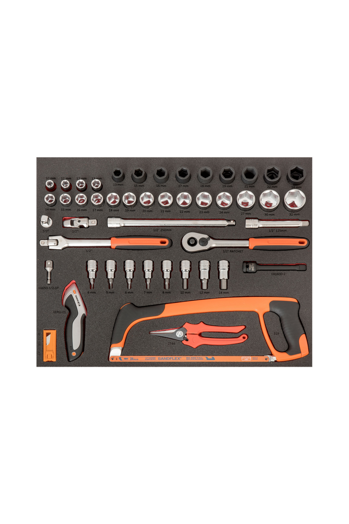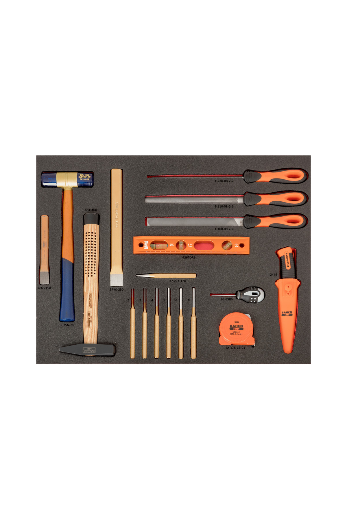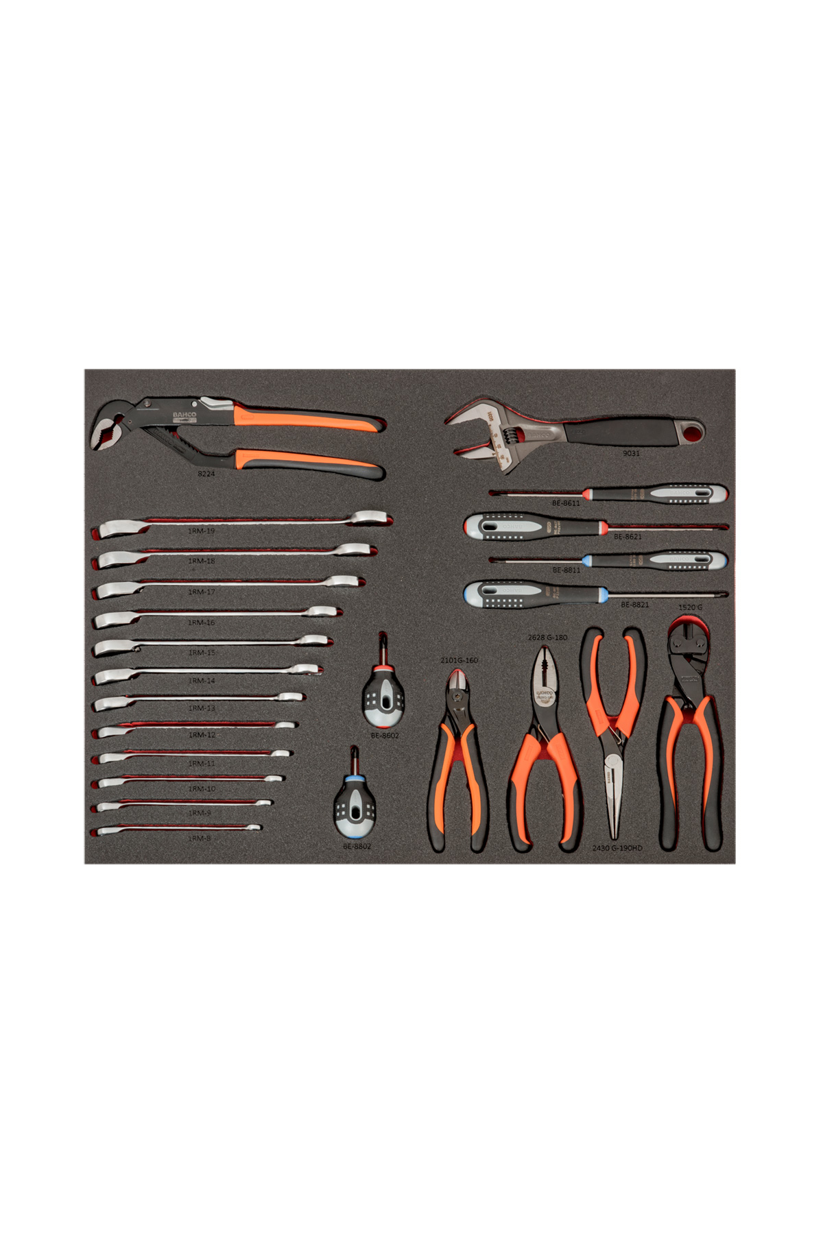 Verktygen ligger i formskurna skuminlägg där varje verktyg har sin plats för att användaren på ett enkelt och överskådligt sätt skall kunna hitta verktyg och även se om något verktyg saknas.