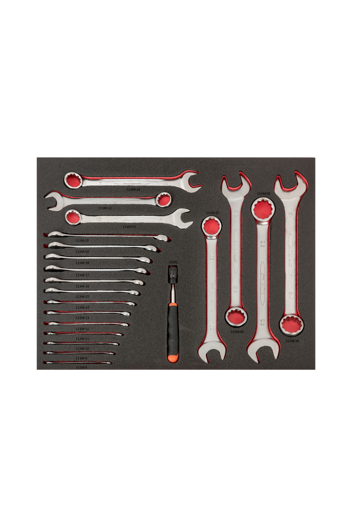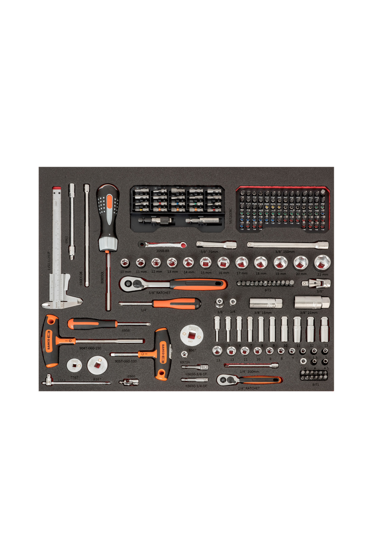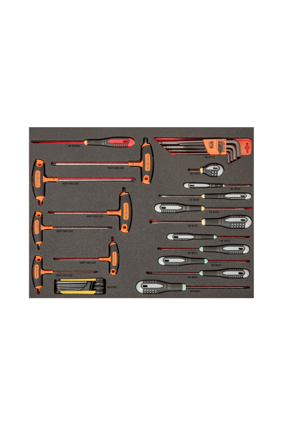 Verktygen ligger i formskurna skuminlägg där varje verktyg har sin plats för att användaren på ett enkelt och överskådligt sätt skall kunna hitta verktyg och även se om något verktyg saknas.